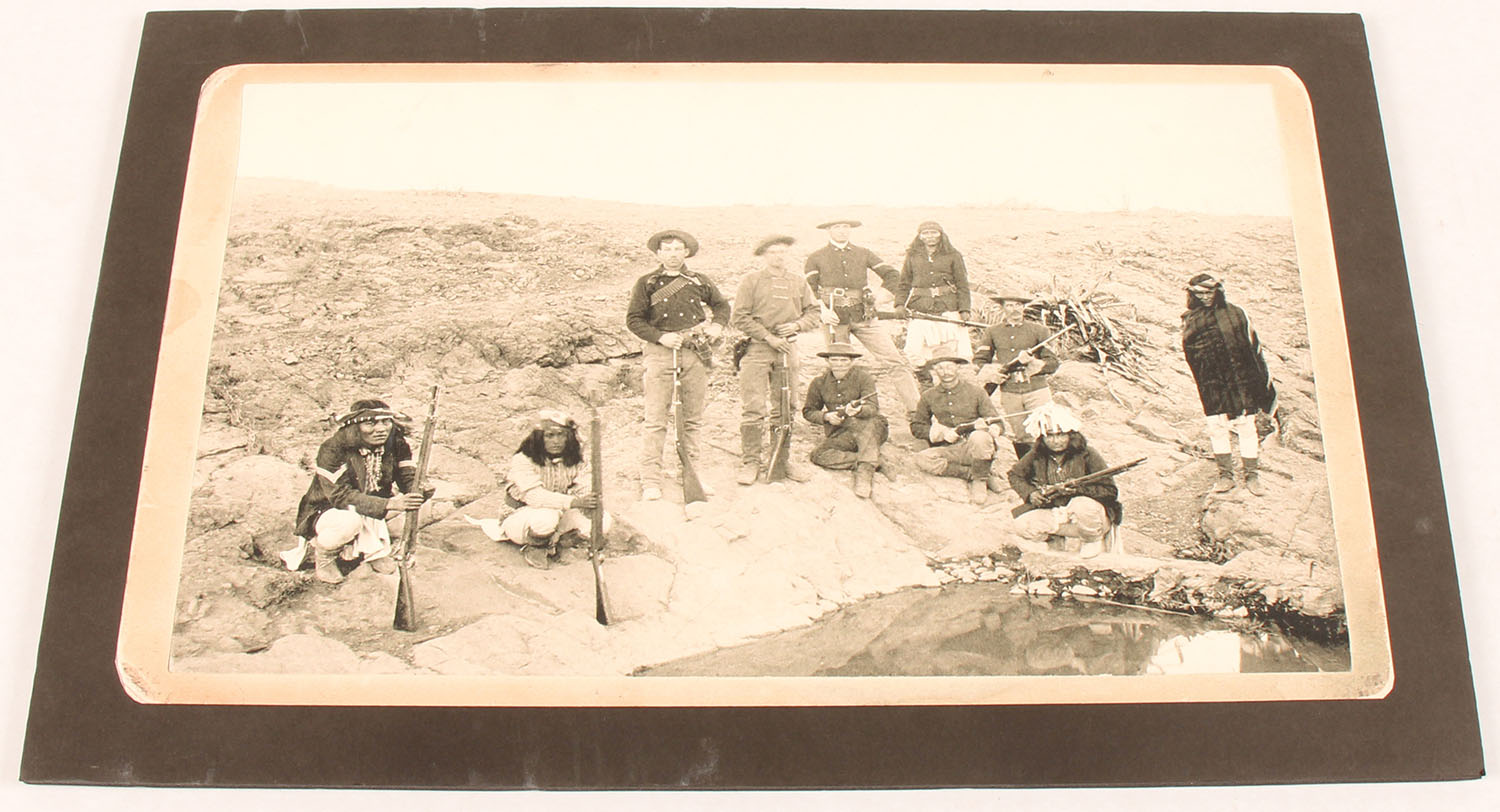 Unknown Artist or Photographer ''GUARDING THE WATERHOLE'', cut out of image glued to black cardboard, pictures a group of men with guns guarding a waterhole, 17 3/4'' x 11 3/4''. Grade: Very Good++ - Value: 10 to 50