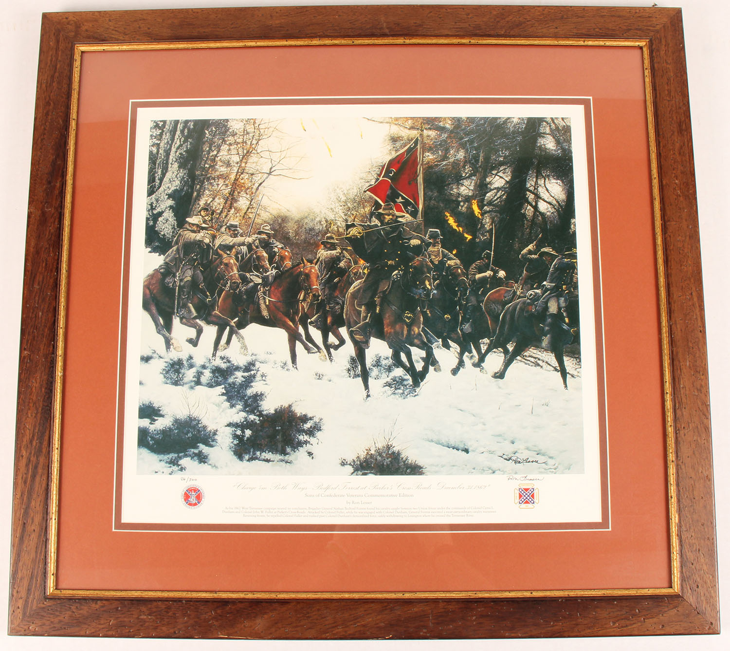 Ron Lesser, ''CHARGE 'EM BOTH WAYS - BEDFORD FOREST AT PARKER'S CROSS ROADS - DECEMBER 31 1869'', signed, 26/500, features a full color image of a group of Union troops, excellent colors, there is a brief description of the photo at the bottom of the print, framed, 29 1/2'' x 28''. Grade: Excellent - Value: 50 to 250