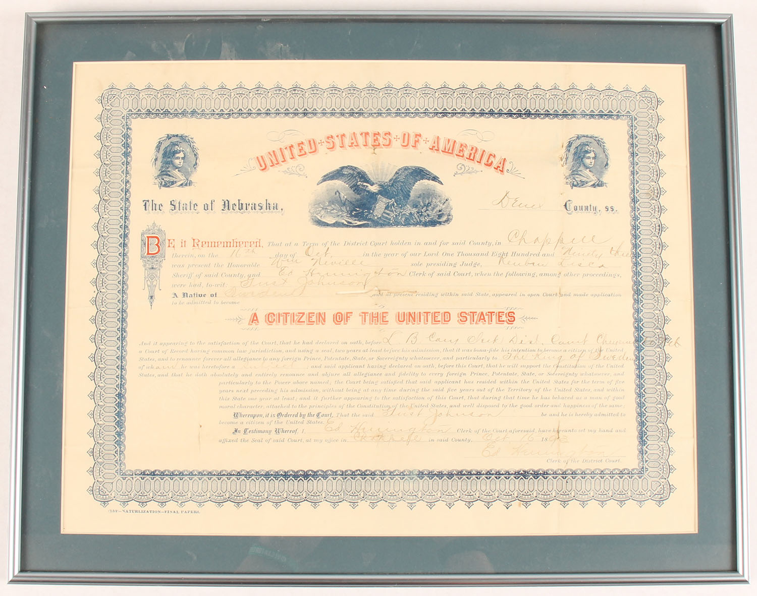 Citizen of the United States Certificate issued in 1993. framed, 15'' x 12''. Grade: Excellent - Value: 10 to 50