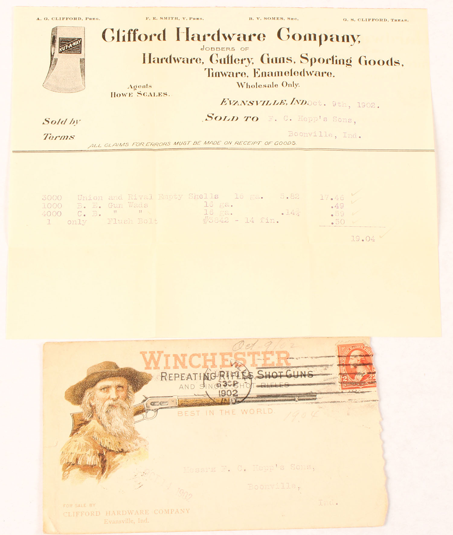 Early Winchester Repeating Rifles, Shot Guns Envelope, 1902 , fantastic full color image of old Chin Whiskers & a model 73. Grade: Very Good ++ - Value: 40 to 100