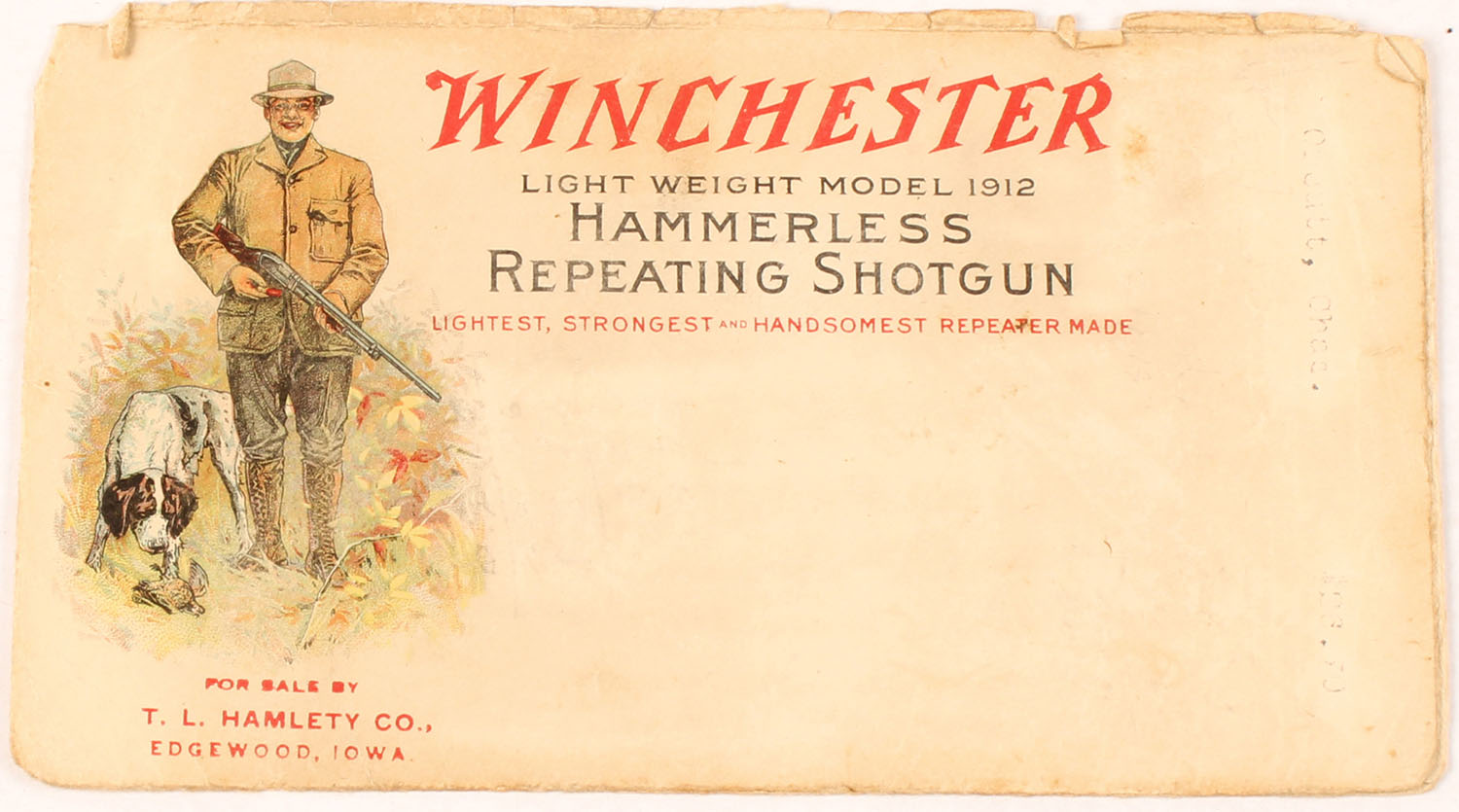 Winchester Light Weight Model 1912 Envelope, ''HAMMERLESS REPEATING SHOTGUN'', no date, has excellent full color image of a hunter & his dog standing over a bird, top folding flap is missing & cut along bottom, light age soiling. Grade: Good++ - Value: 20 to 80