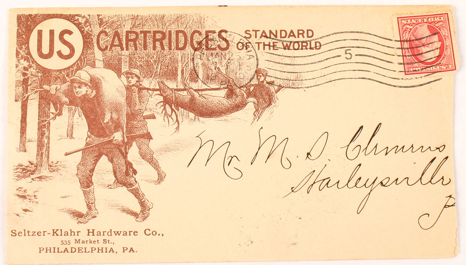 U.S. Cart. Co. Envelope,1910, pictures single color image of deer hunters bringing back two buck deer, cut on right side, Grade: Very Good + - Value: 20 to 80