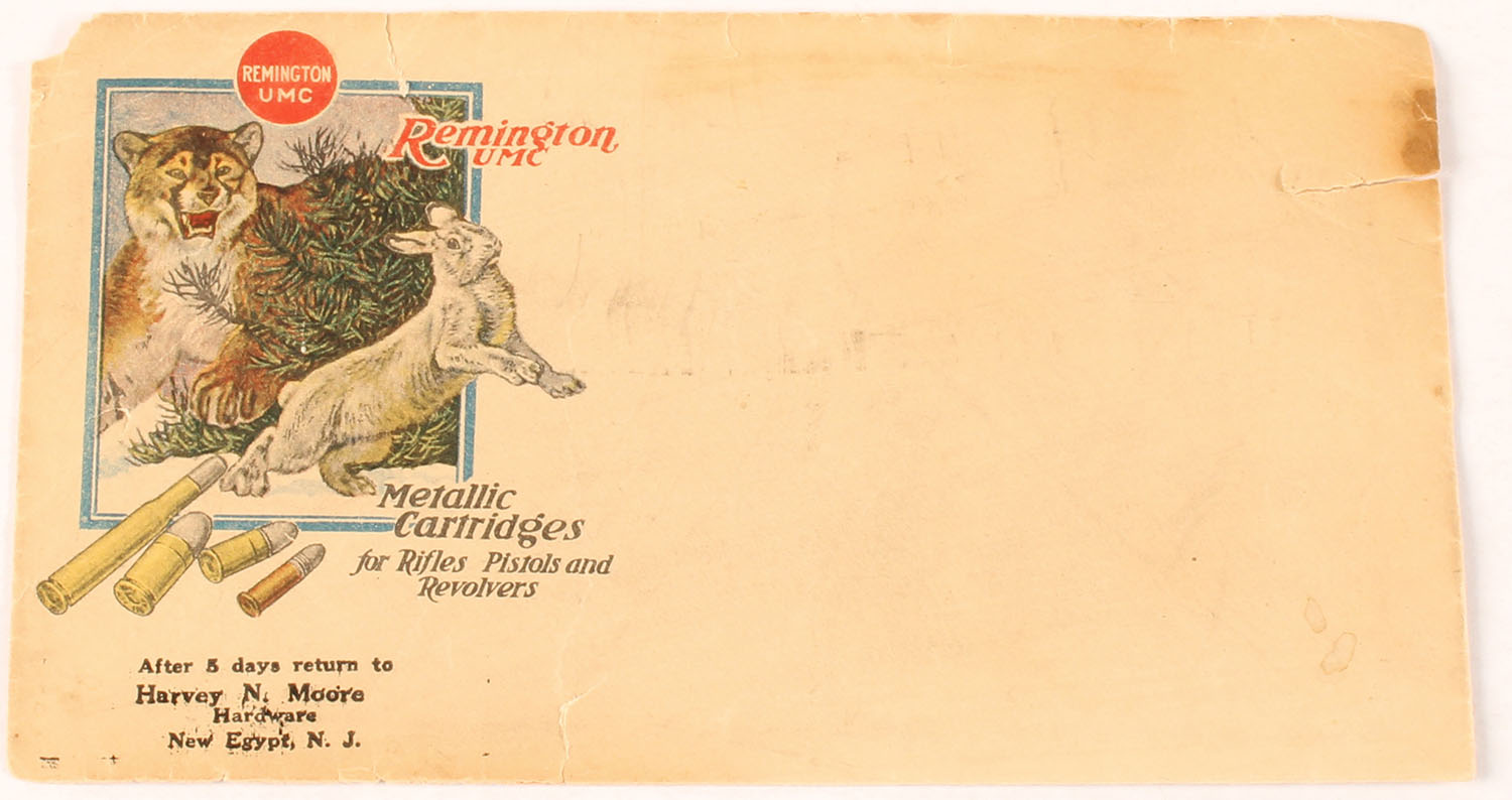 Remington UMC Envelope, unused, no date, has wonderful full color scene of bobcat chasing a rabbit in the snow, back is unmarked, shows some age soiling with nice colors. Grade: Very Good - Value: 50 to 200
