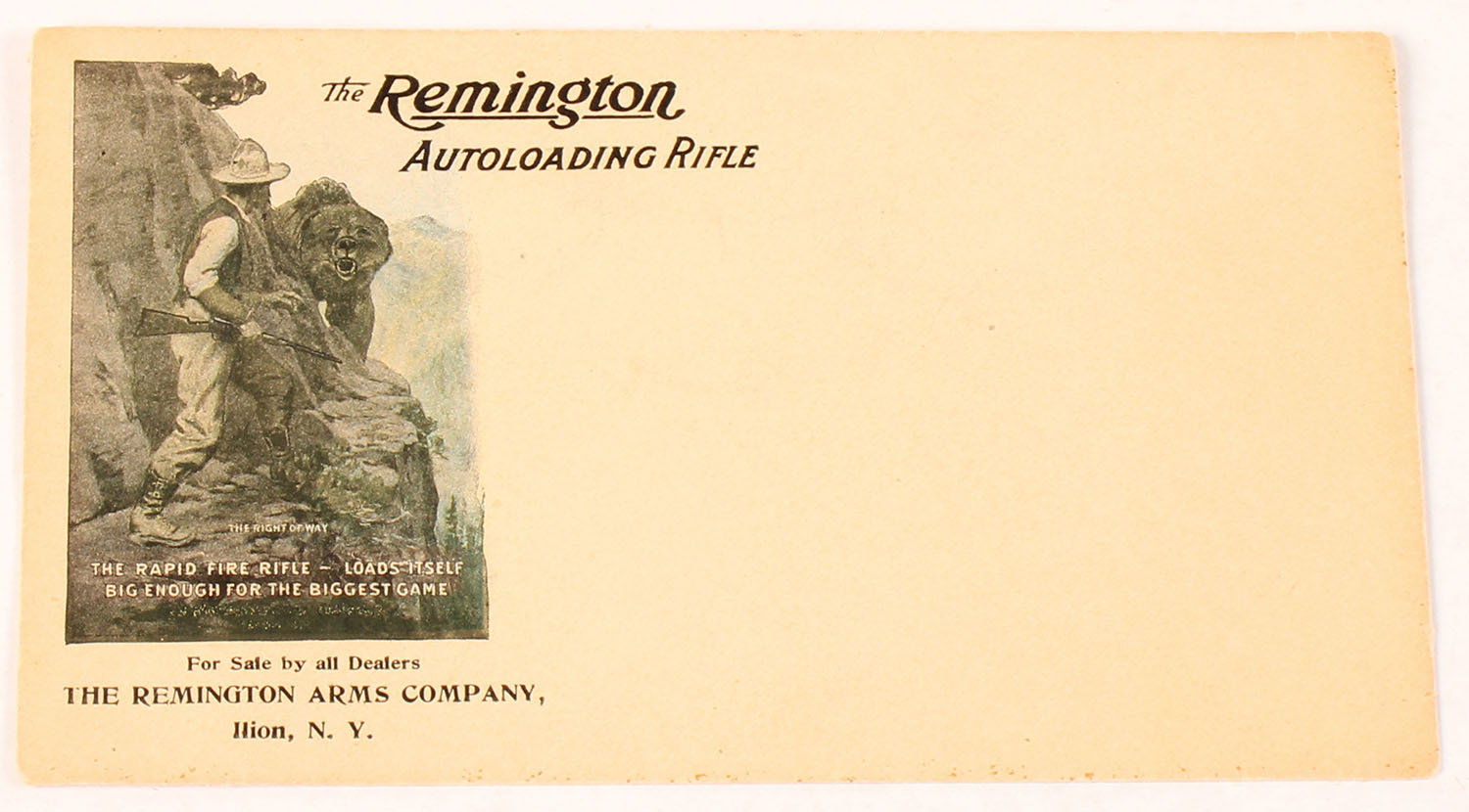 Remington Arms Co. Envelope, ''THE REMINGTON AUTOLOADING RIFLE'', unused, no date, pictures a b/w image of man crossing paths with a grizzly, advertising on back. Grade: Excellent + - Value: 50 to 150