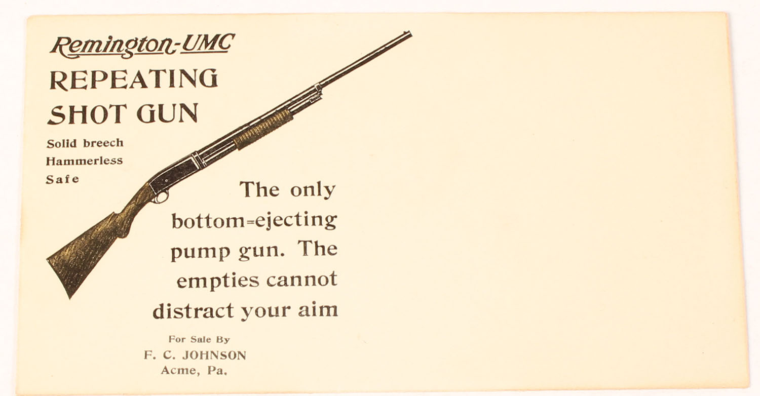 Remington- UMC Envelope, ''REPEATING SHOT GUN'', unused, no date, pictures an b/w image of a pump action shotgun, red Remington-UMC logo on back. Grade: Excellent - Value: 20 to 80