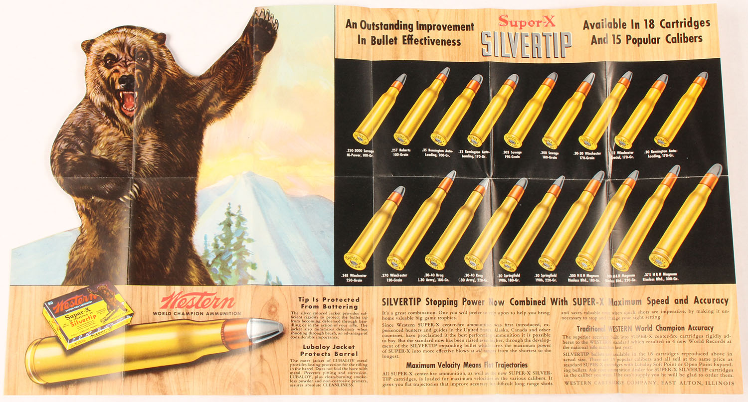 Western Cartridge Co. Silvertip Fold-Out Brochure, features a full color image of a grizzly & a silver-tip cartridge on the front. Folds out to 20'' x 11'', inside features a variety of cartridge information, excellent colors & design. Grade: Excellent ++ - Value: 30 to 120