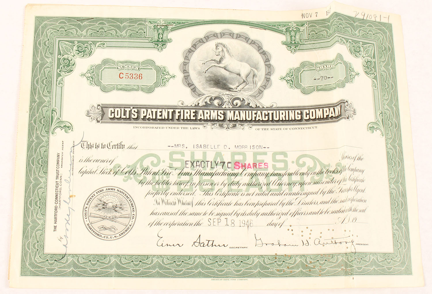 1946 Colt's Patent Fire Arms Manufacturing Company Stock Shares Certificate. 70 Shares. Comes with original receipt & transfer paperwork. Grade: Excellent - Value: 20 to 80