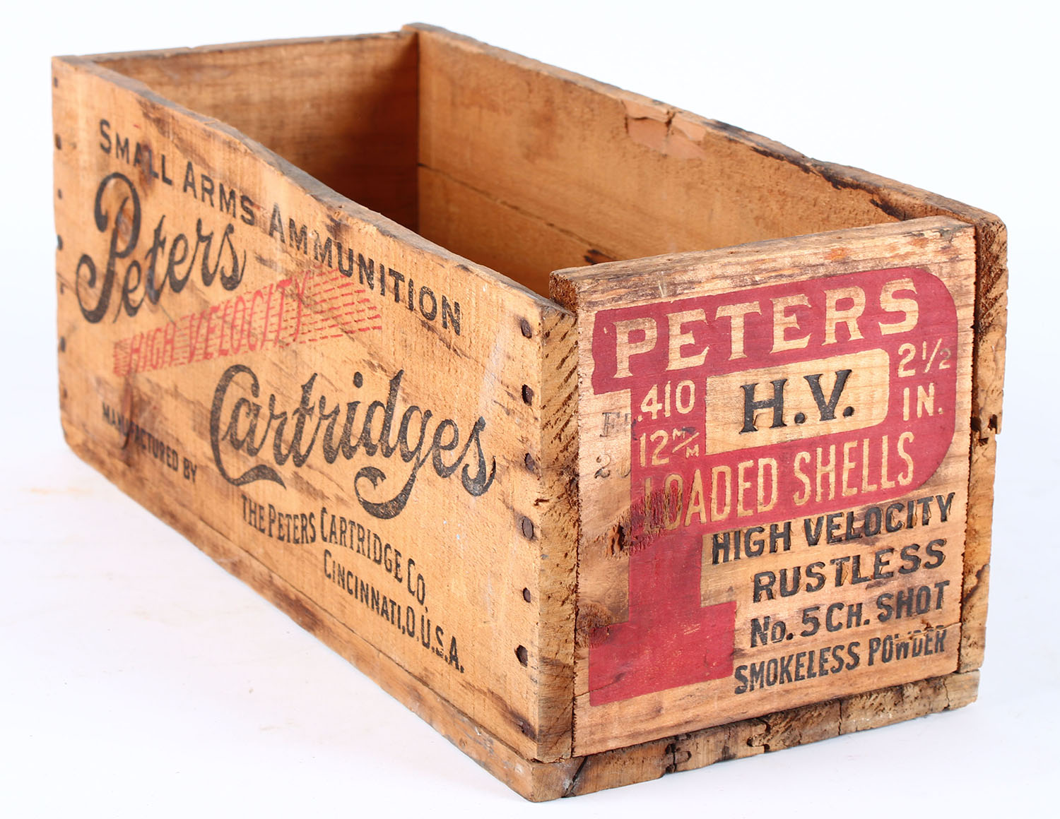 Peters High Velocity wood shipping crate, .410 ga., 5 shot chilled, 2 1/2'', black and red and print is solid, crate is solid. Grade: Excellent ++ - Value: 50 to 150