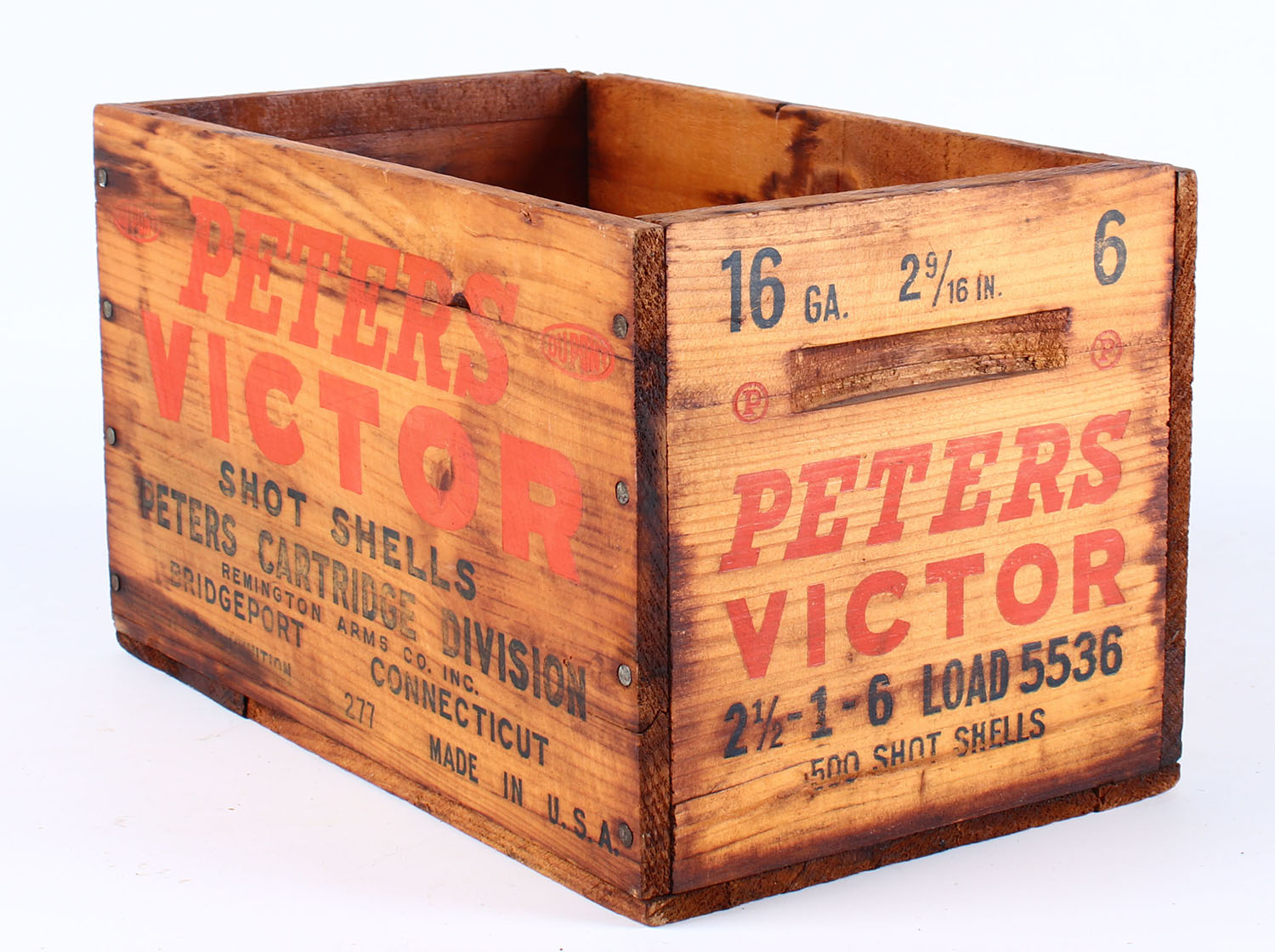 Peters Victor, 16 Ga., 6 shot, blue and orange print is solid and crate has some age soiling. Grade: Excellent - Value: 20 to 60