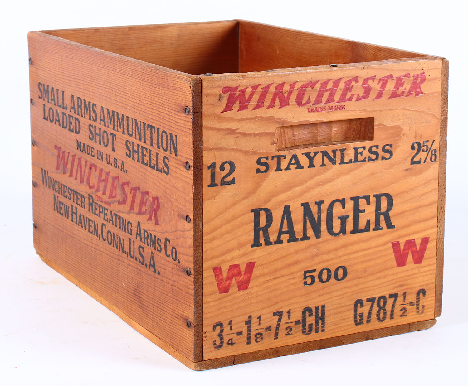 Winchester Ranger wood crate, 3 1/4- 1 1/8 - 7 1/2, red and black print is solid and crate is solid. Grade: Excellent - Value: 16 to 50
