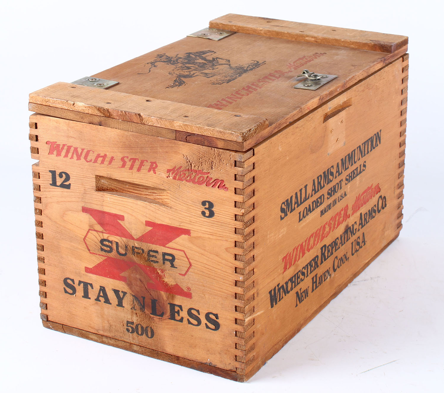 Winchester Super X Staynless wood crate, 12 ga., red and black print is solid and crate is solid but latch is broken. Grade: Excellent - Value: 10 to 50