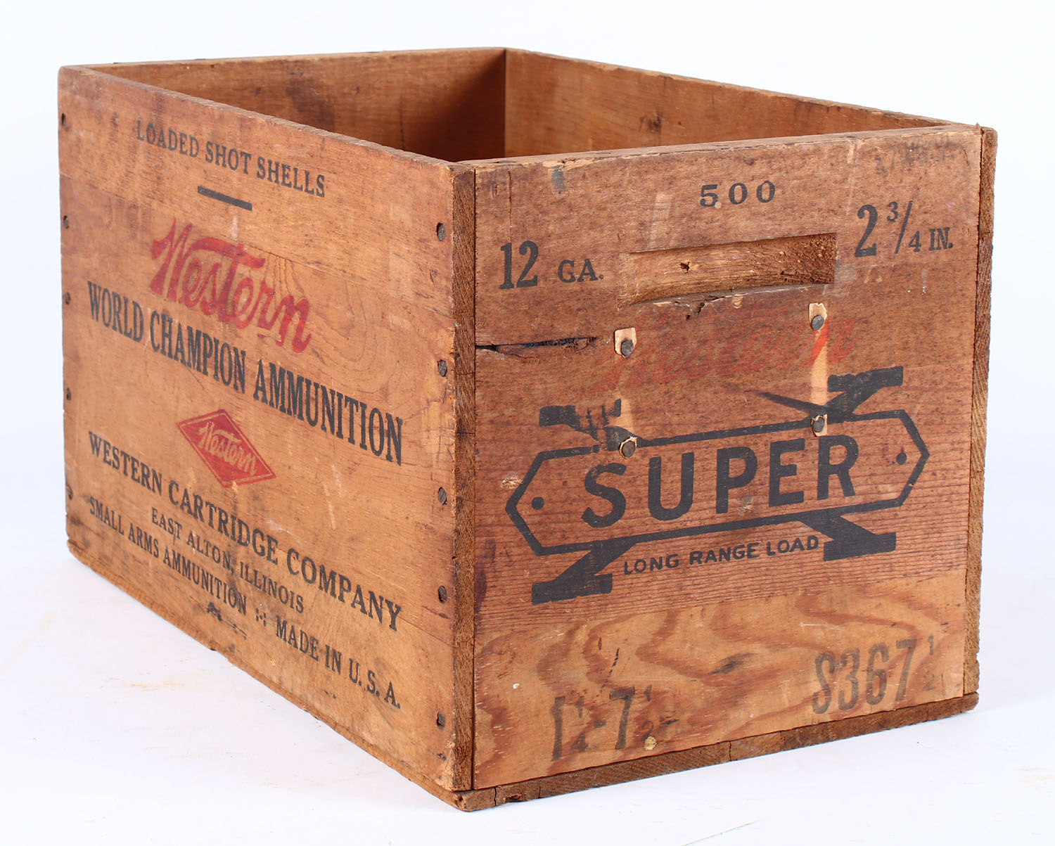 Western Super X wood crate, 12 ga., red and black print is fading and crate has age soiling. Grade: Very Good ++ - Value: 16 to 60