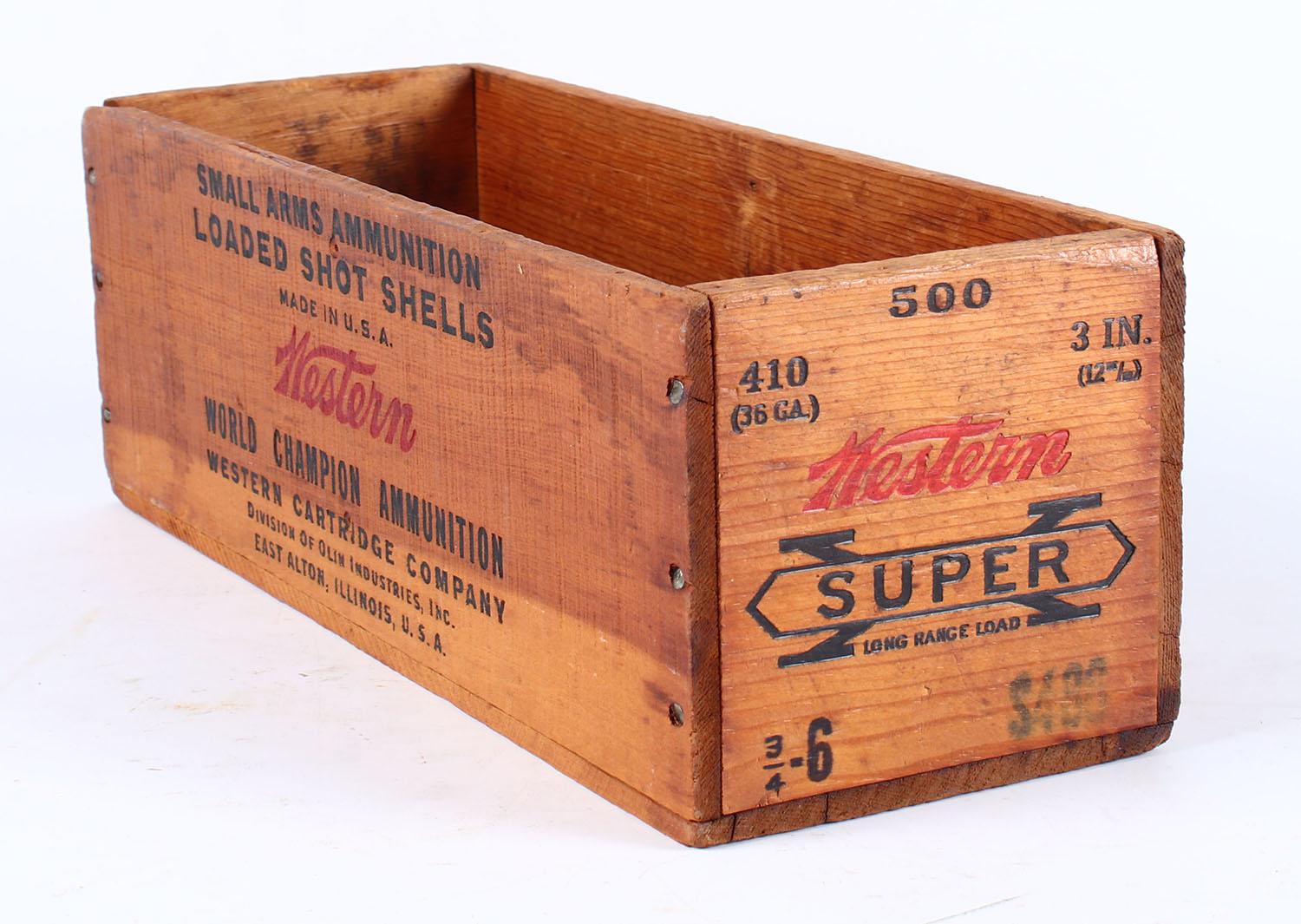 Western Super X wood crate, 410 ga., red and black print is solid and crate solid. Grade: Very Good ++ - Value: 40 to 100