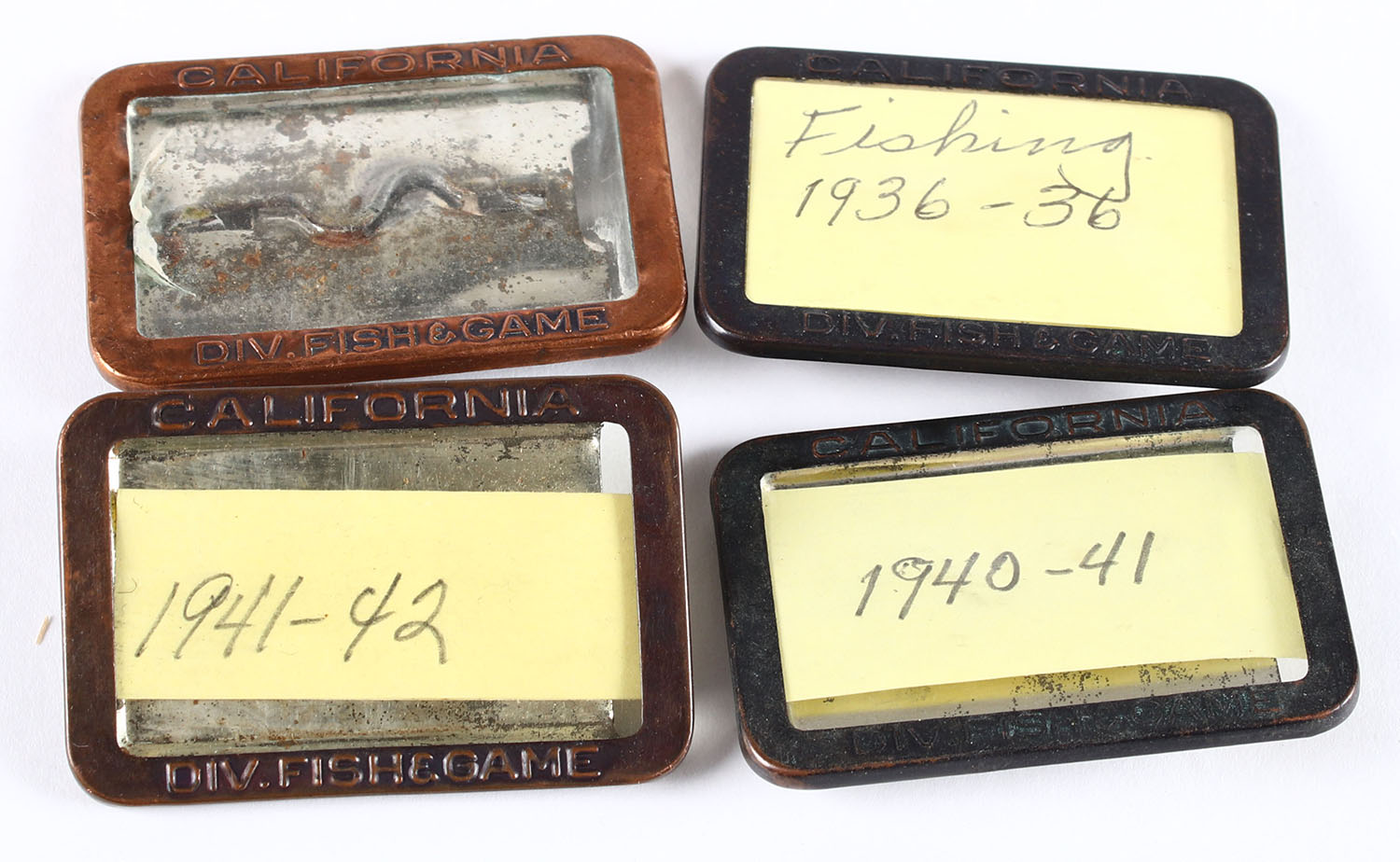Lot of 4 Rare 1930-40s California Division Fish & Game License badges. Grade: Excellent - Value: 4 to 60