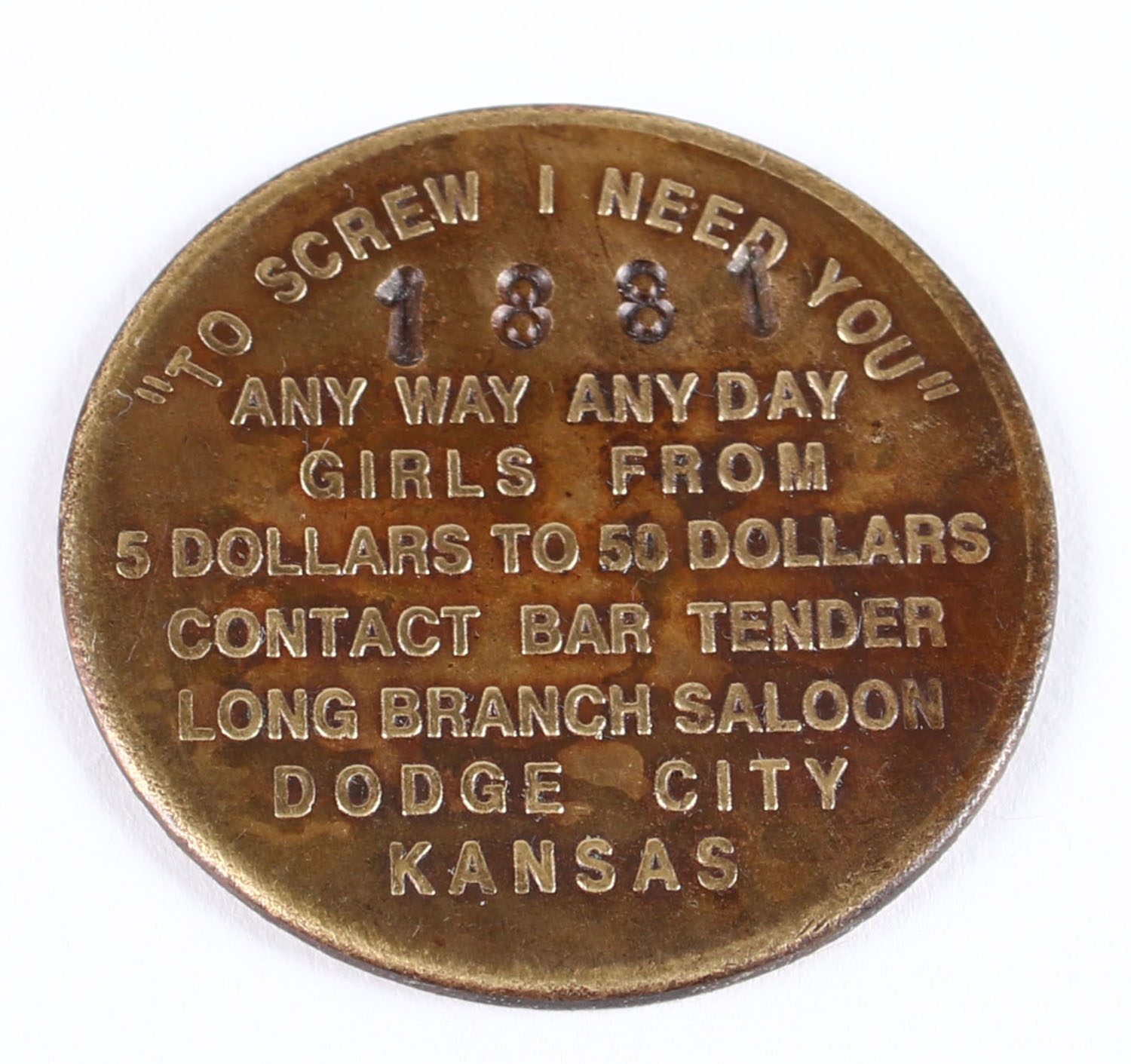 Brothel token, double sided, dated 1881. Grade: Excellent - Value: 20 to 80
