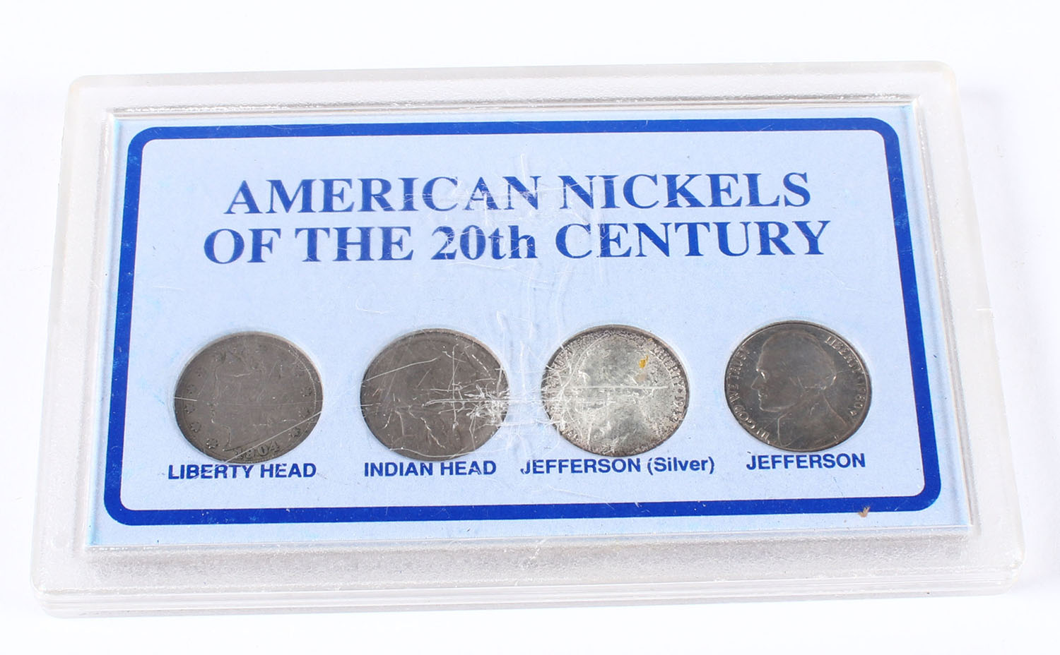 American Nickels of the 20th century case, 4 nickels, 1904-1980 date range. - Value: 10 to 20