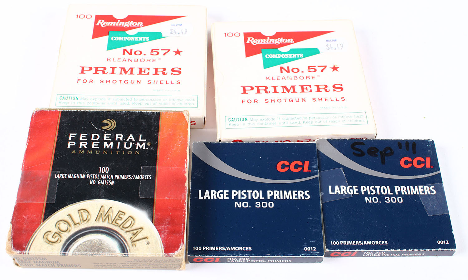 Lot of 5 primer boxes, CCI and Rem Full and Federal is nearly empty. Grade: Very Good ++ - Value: 10 to 50