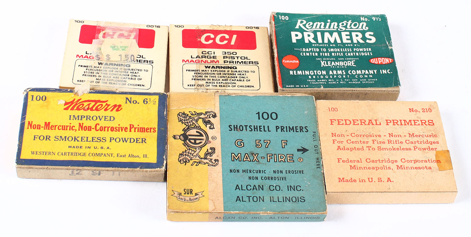 Lot of 6 primer boxes, all partial. Grade: Very Good - Value: 4 to 40