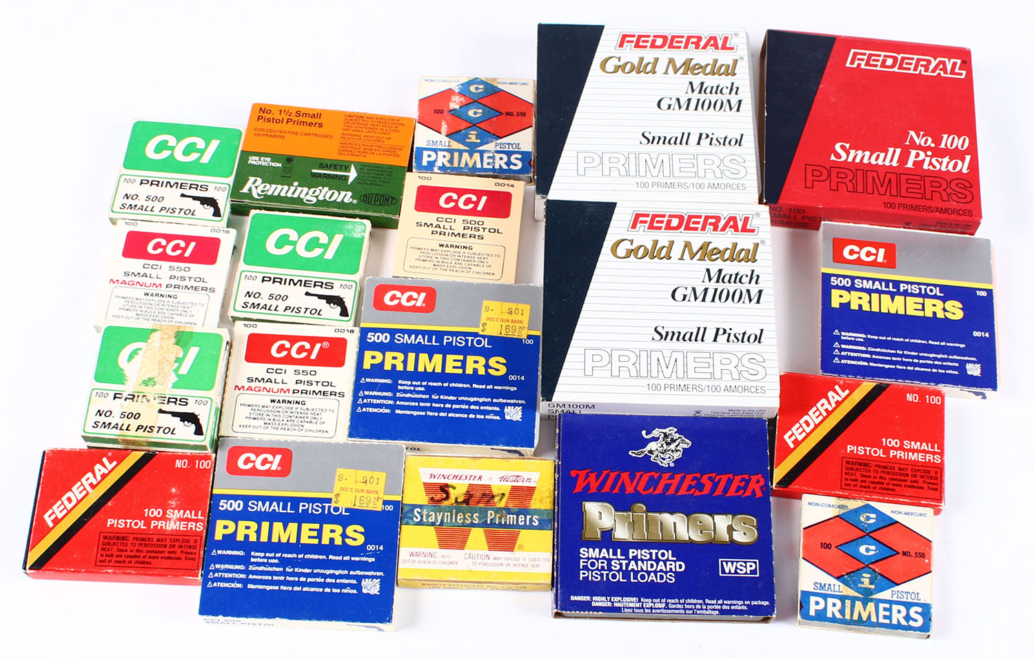 Large lot of primer boxes, all partial. Grade: Very Good - Value: 30 to 90