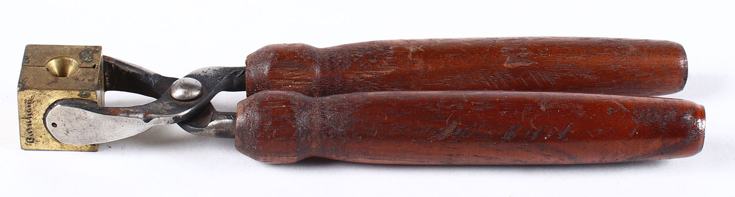 RARE! Mark B Burnharm bullet molds, made in Savannah, Georgia ca 1950-1968, this tool not dated and .340 cal., blonde wood handles. Grade: Excellent TQ - Value: 40 to 80