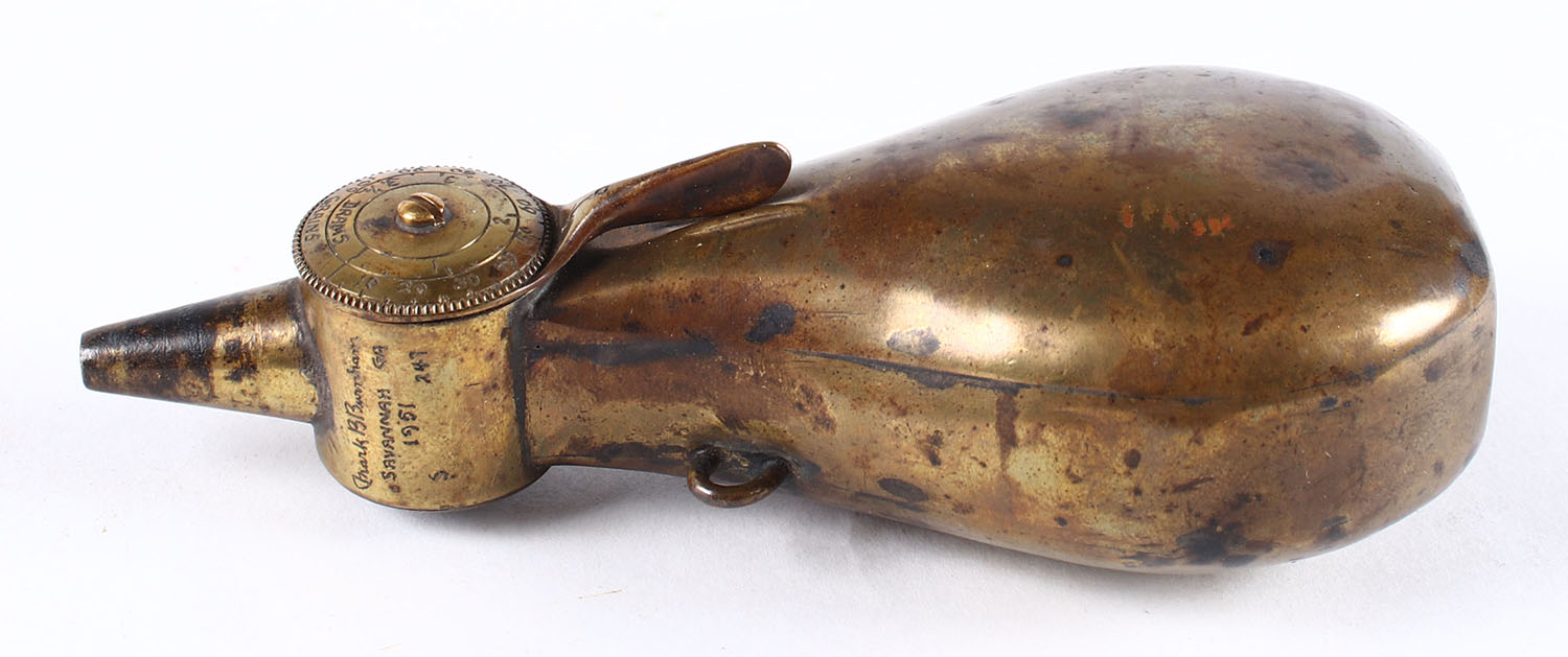 RARE! Mark B Burnharm Brass powder flask, made in Savannah, Georgia, this flask dated 1951 and #247, has age soiling. Grade: Excellent TQ - Value: 50 to 200