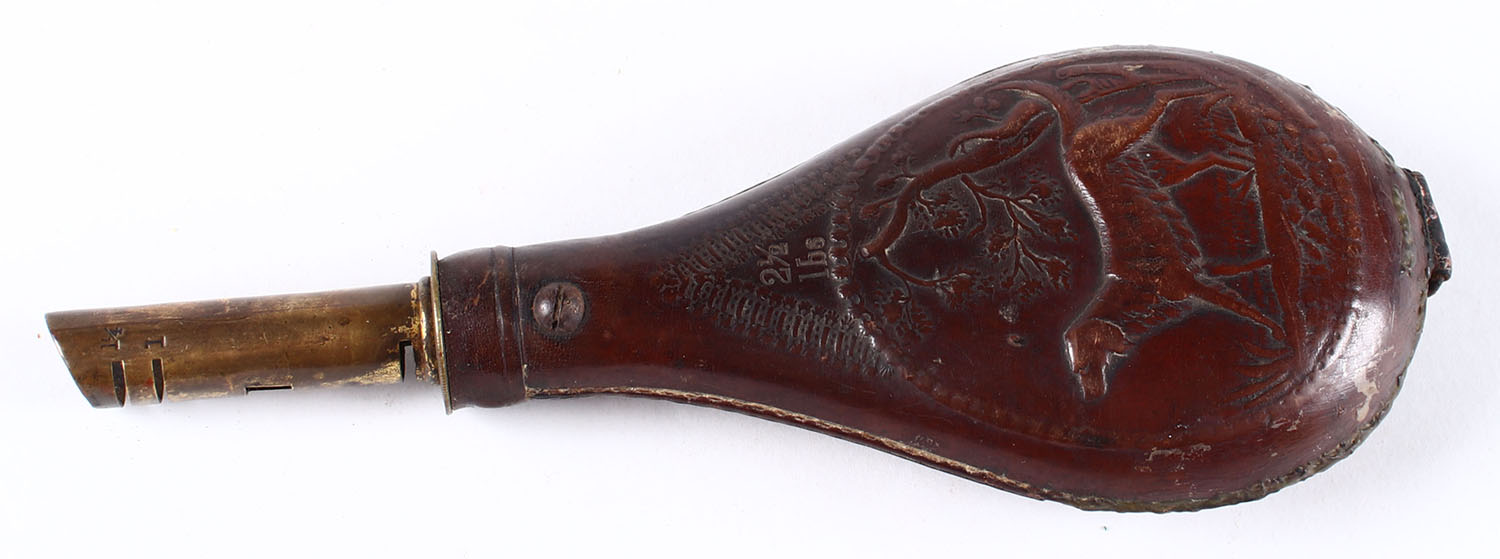 AM. Flask & cap CO. Antique Brass and leather powder flask. Grade: Excellent - Value: 10 to 100