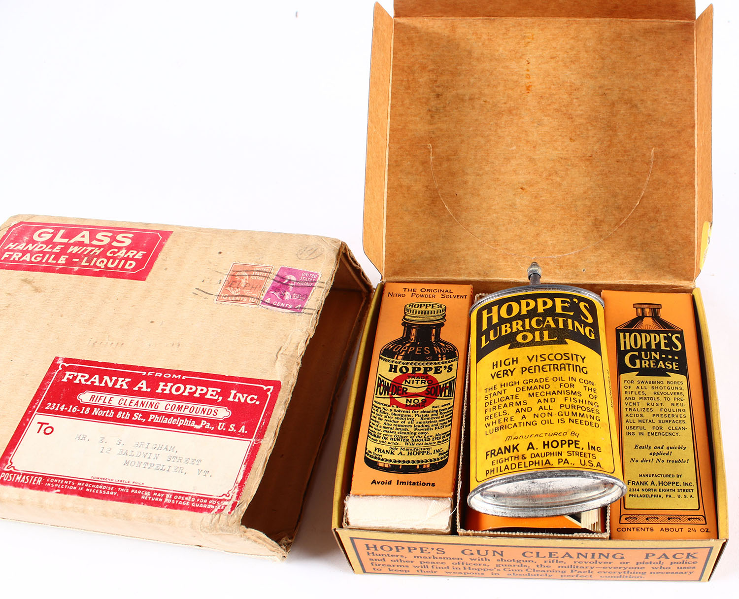 Hoppes Gun Cleaning Pack, Full & Complete with oil tin!, inside contents are bright and clean, oil tin is Full and outside box is very solid, bright and clean, with original cardboard shipping box. Grade: Excellent - Value: 50 to 250