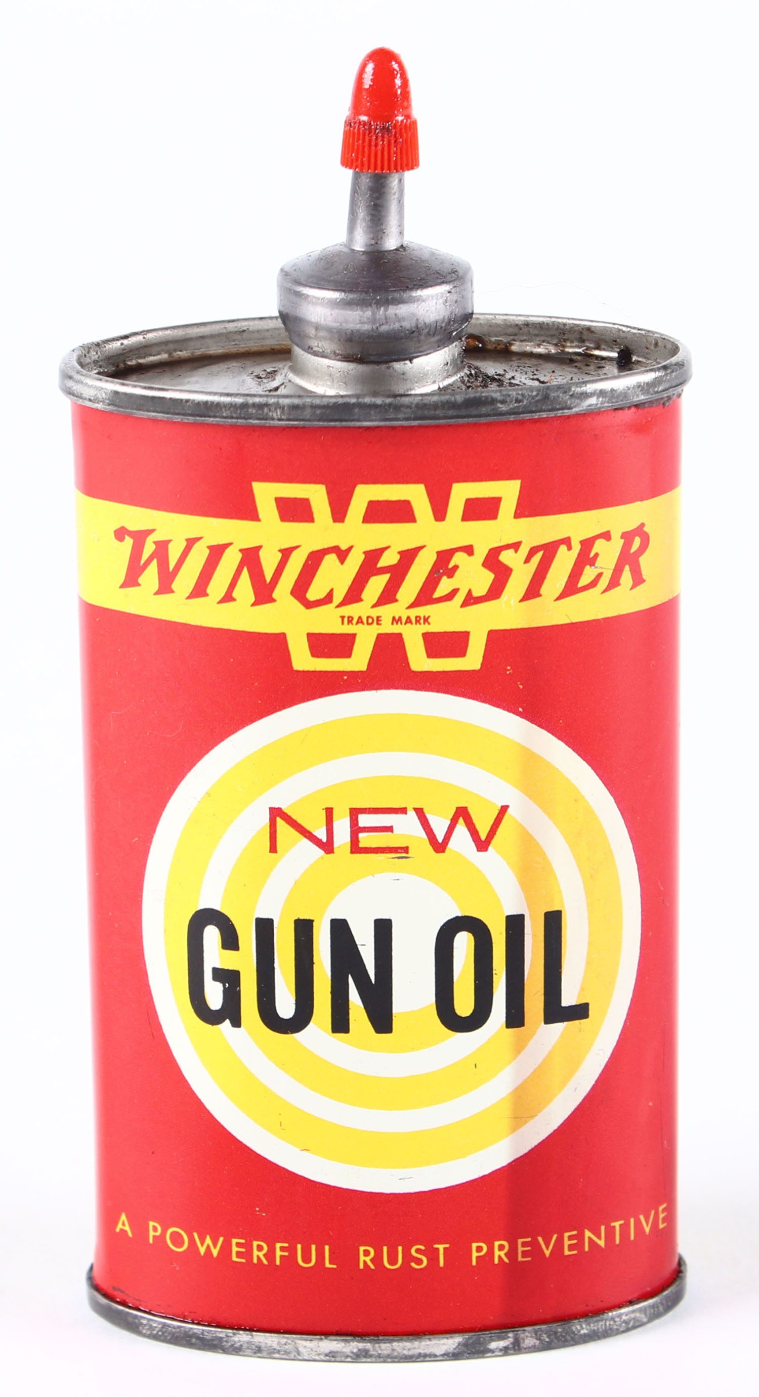 Winchester New Gun oil tin, lead spout and plastic cap , Empty but some has leaked out. Grade: Excellent - Value: 10 to 50