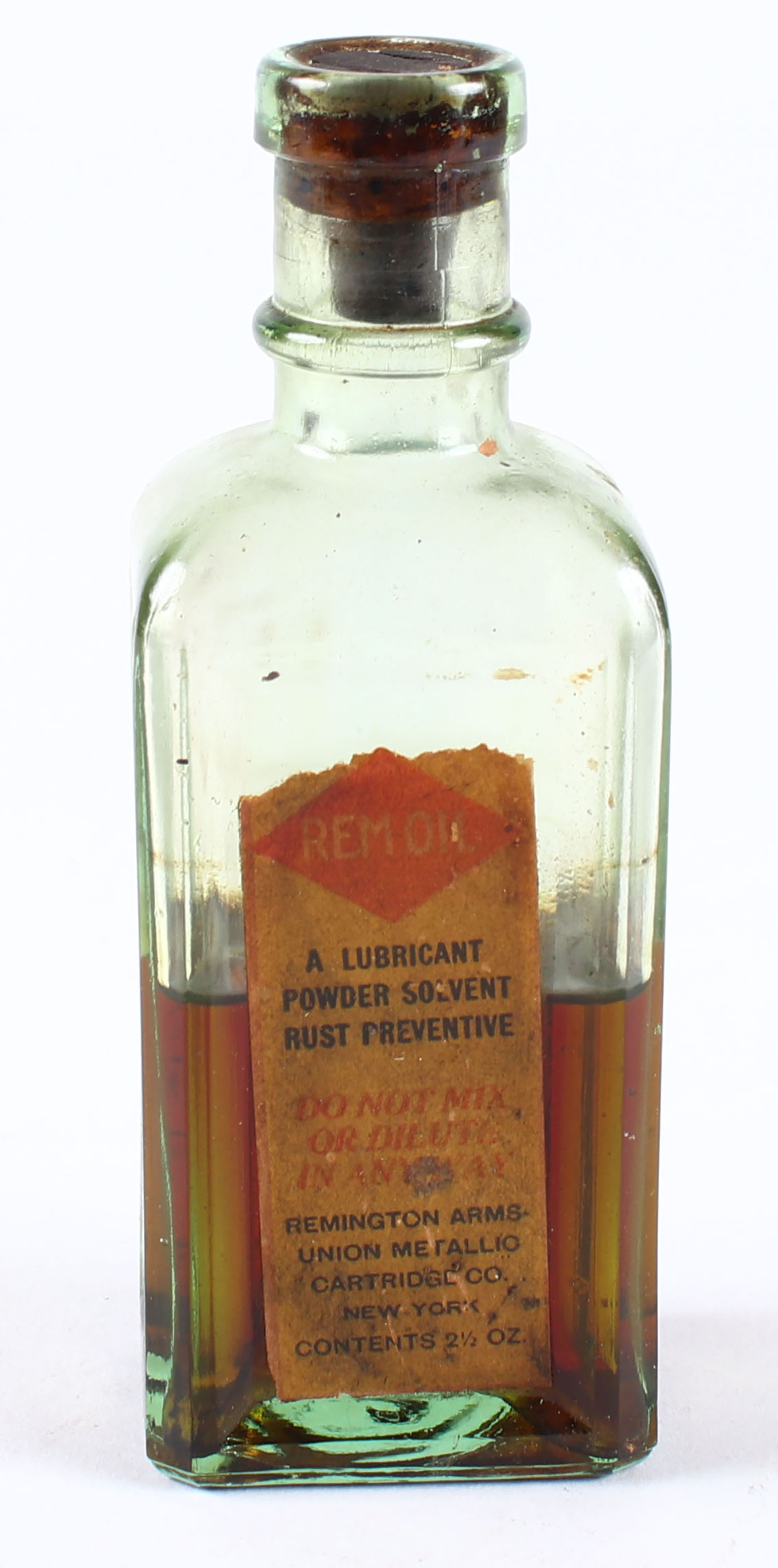 Remington Gun Oil glass jar, partial, label has age soiling. Grade: Very Good + - Value: 20 to 60