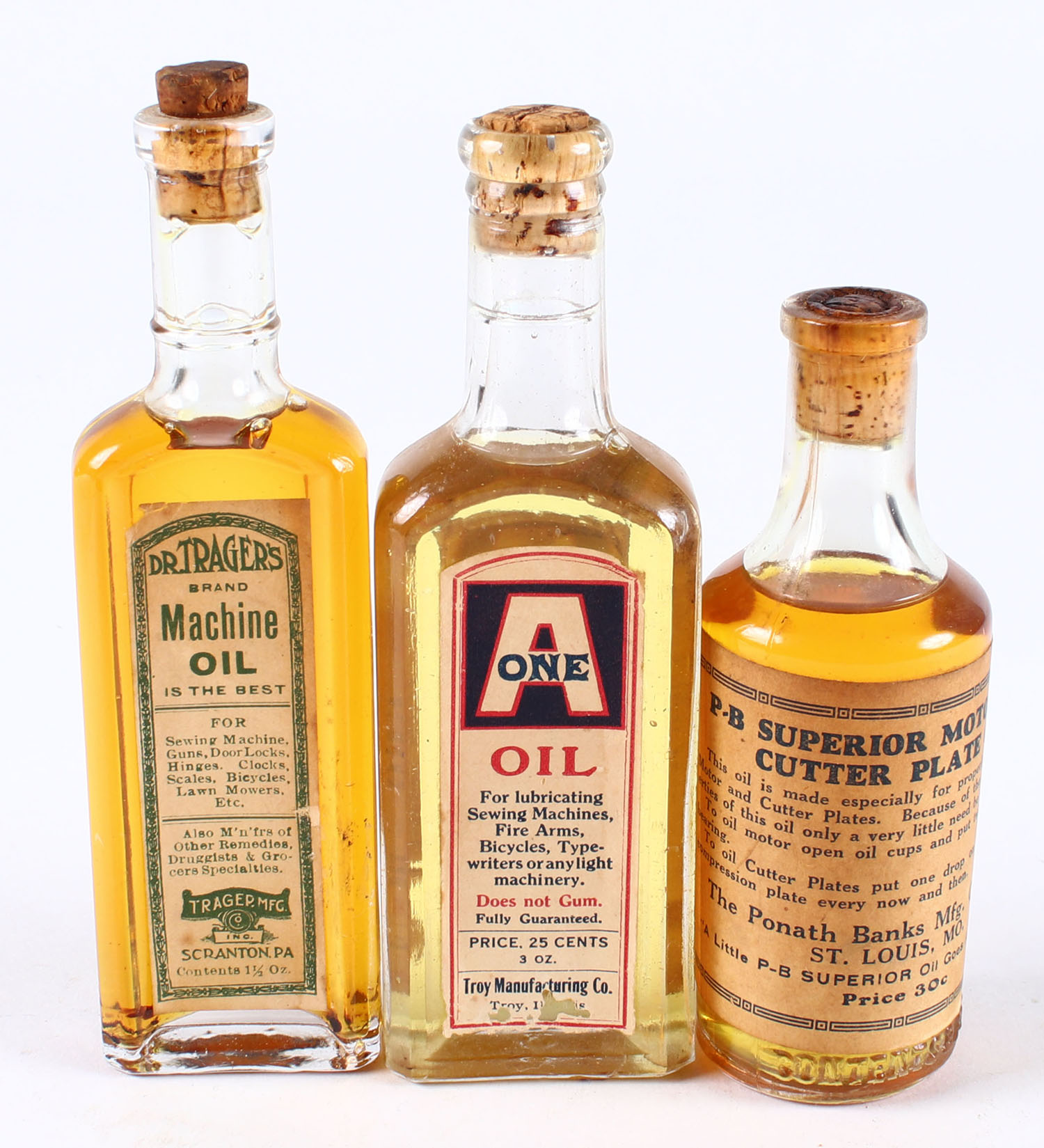 Lot of 3 Antique Oil glass jars, all FULL, labels are all bright and clean. Grade: Excellent + - Value: 40 to 100