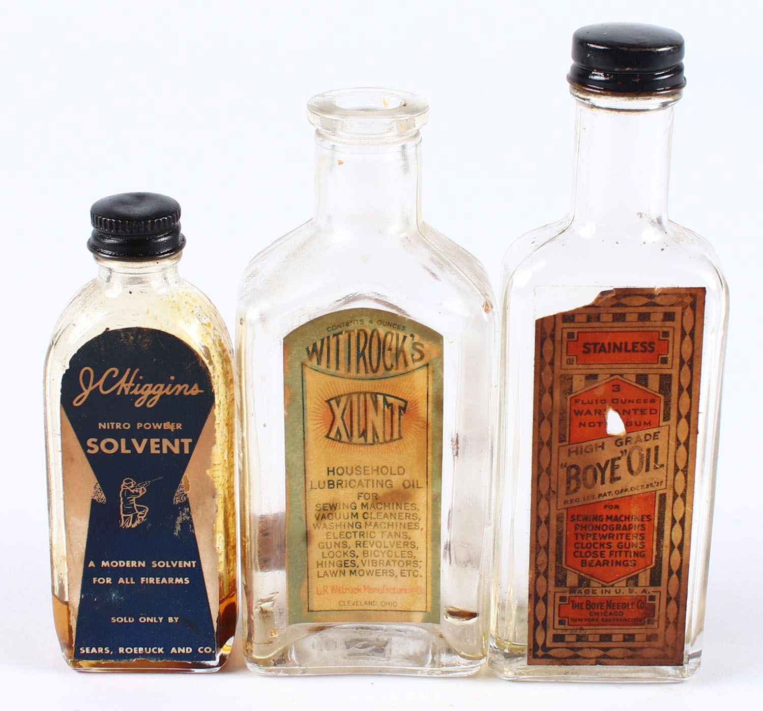 Lot of 3 Antique Oil glass jars, all empty, labels are solid with light soiling. Grade: Excellent - Value: 4 to 40
