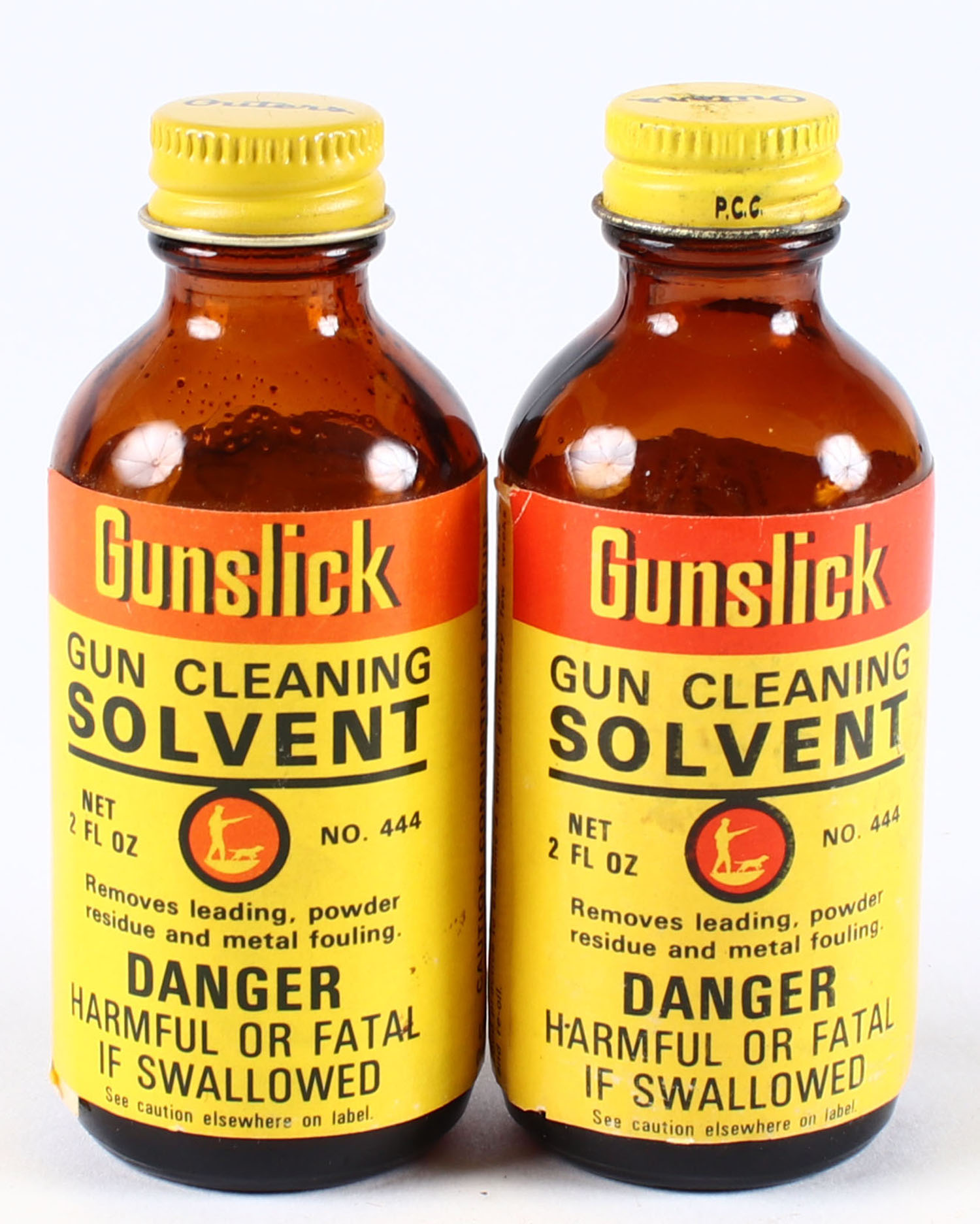 Lot of 2 Gunslick gun cleaning solvent glass jars, both nearly FULL, labels are all bright and clean. Grade: Excellent + - Value: 10 to 50