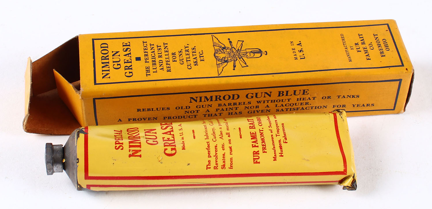 Nimrod Gun Grease, FULL, in original box, all bright and clean. Grade: Excellent ++ - Value: 16 to 50