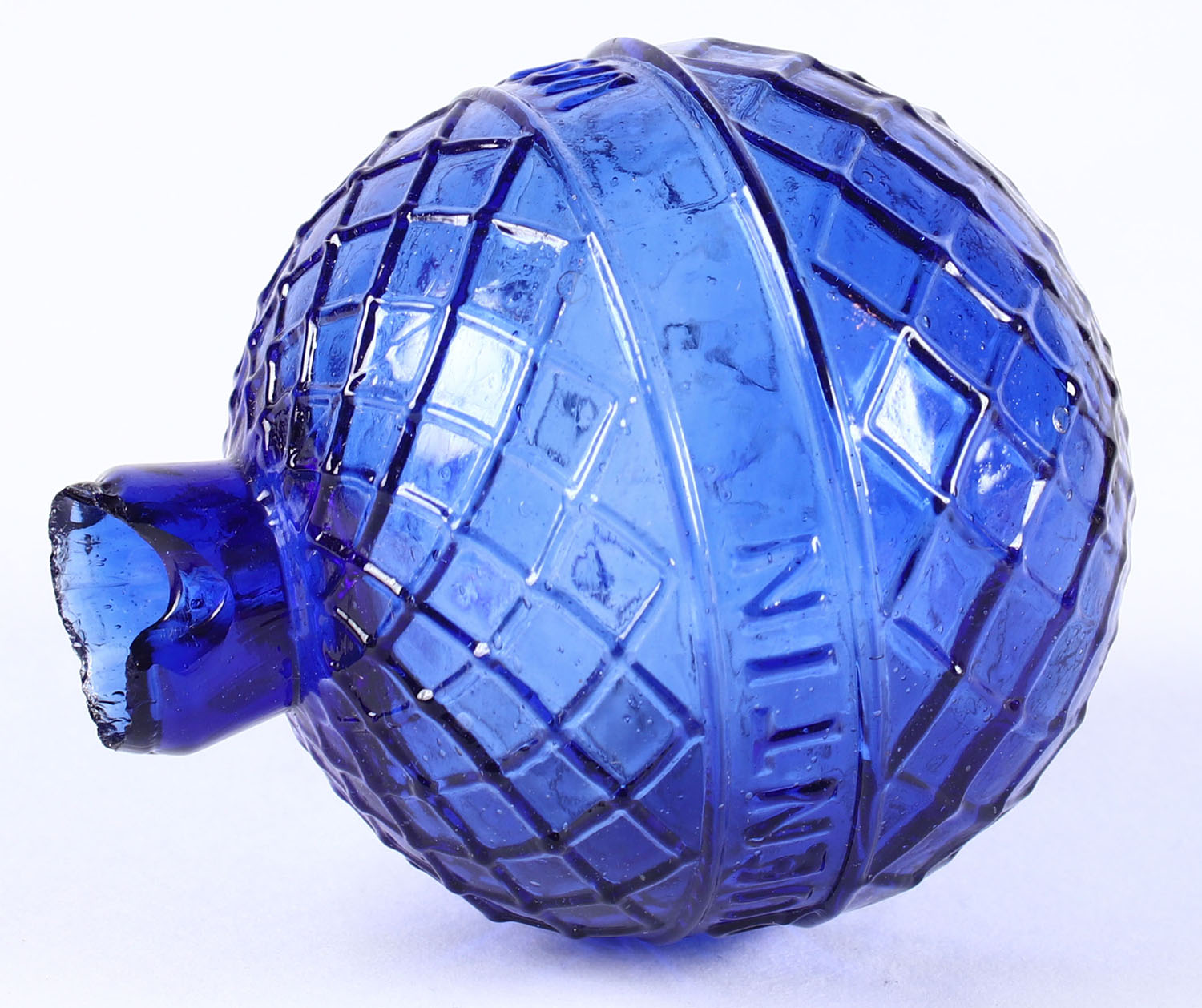 RARE! Dark Blue Glass Target Ball, fishnet design, ''Van Custom A St Quentin 3 piece, high neck, wonderful condition. Grade: Excellent ++ - Value: 300 to 600