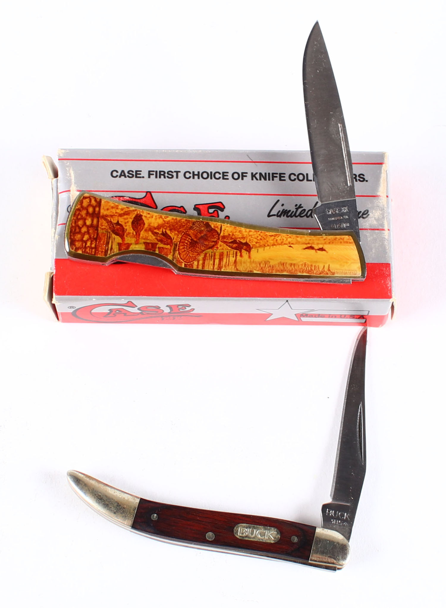 Lot of 2 knives, 1 is a Case folding knife and has case box, other knife is a buck knife. Grade: Excellent - Value: 30 to 60