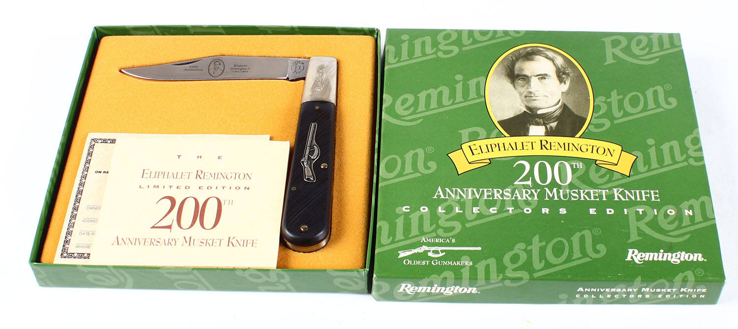 Remington folding blade knife, 200th anniversary Musket knife, Eliphalet Remington, in original box. Grade: Excellent ++ - Value: 50 to 100