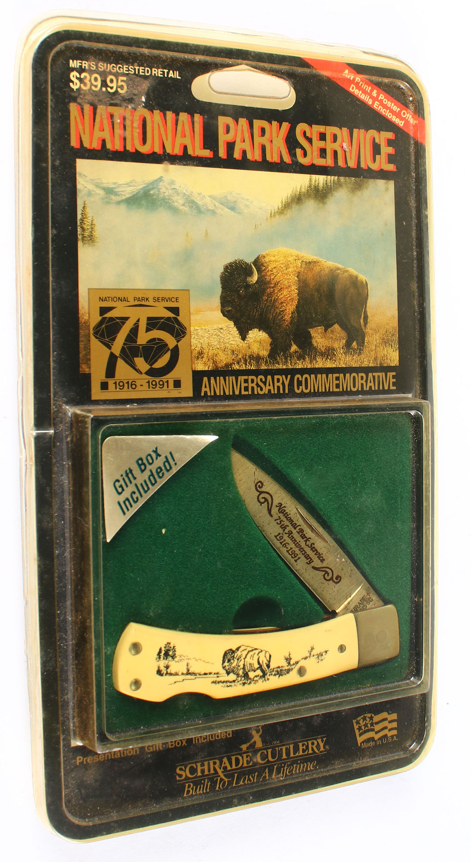 Schrade National park service 75th anniversary knife, in original box. Grade: Excellent ++ - Value: 30 to 90