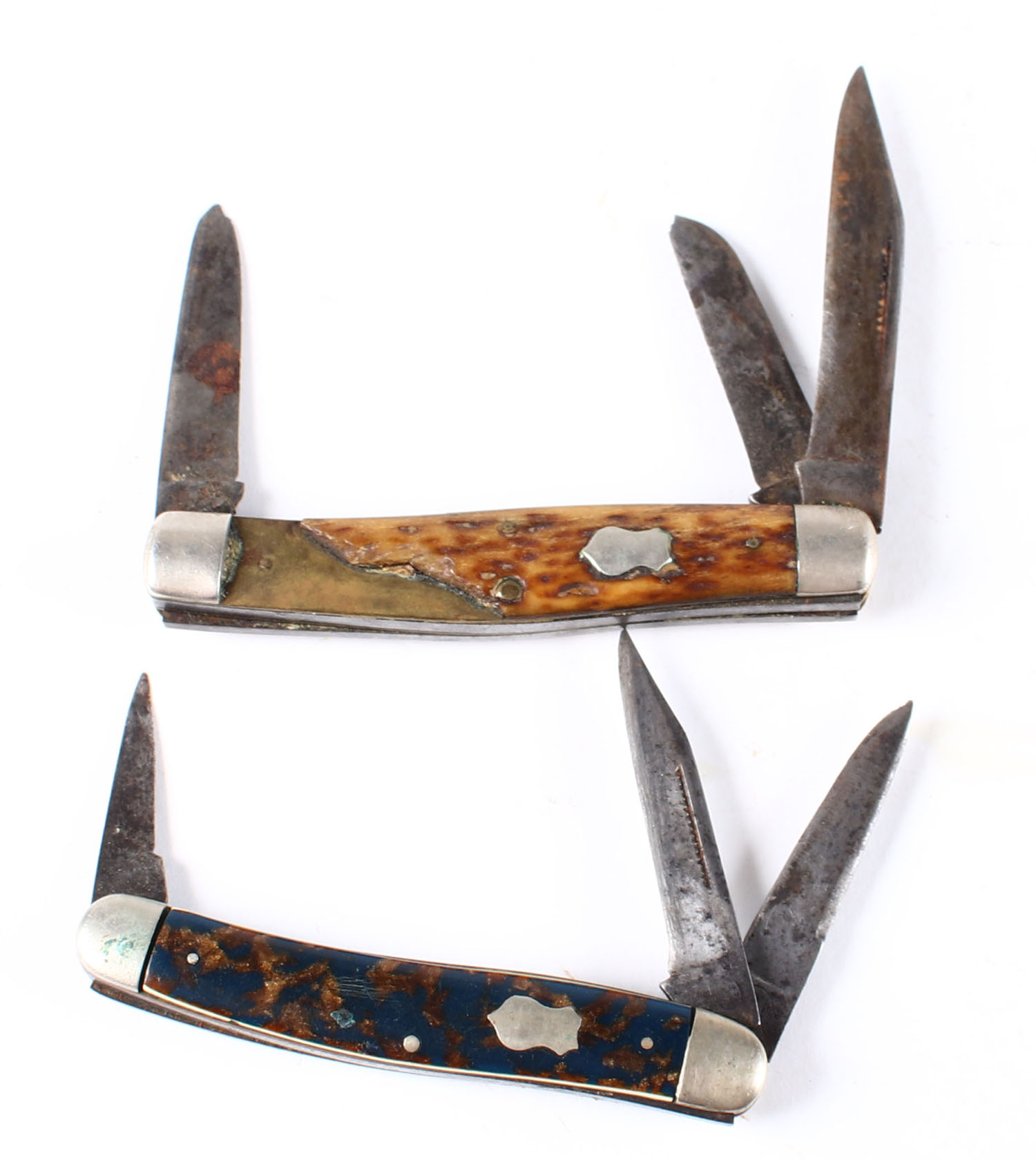 Lot of 2 1930s Remington folding knives, #R3615-J and unknown. Rust spotting, sharpened blades broken & missing chips to the scales. Grade: Fair - Value: 20 to 100