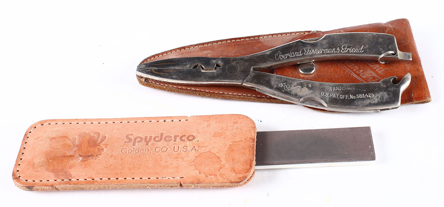 Lot of 2, Overland Fisherman's Friend plyers and a Spyderco marked leather pouch with a knife sharpener. Grade: Excellent ++ - Value: 16 to 50