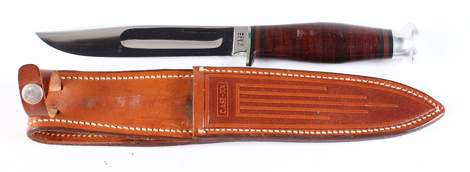 Case knife, fixed blade, in leather sheath, 5.5'' blade, leather handle, aluminum pommel. Grade: Excellent ++ - Value: 100 to 300