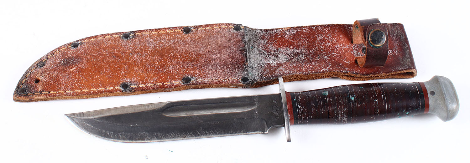 RH-36 Pal knife, fixed blade, in leather sheath, 5.75'' blade, leather handle, aluminum pommel. Grade: Excellent ++ - Value: 40 to 100