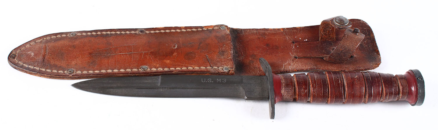 US M3 knife, fixed blade, in leather sheath, 5.5'' blade, leather handle. Grade: Excellent - Value: 20 to 80