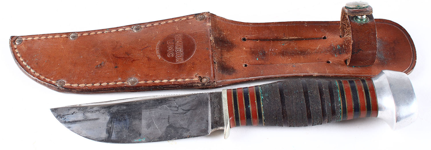Vintage 1930s Remington knife, fixed blade, has leather sheath, 5.5'' blade. Grade: Excellent - Value: 40 to 150