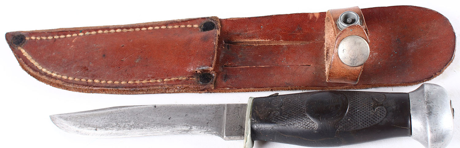 Vintage 1930s Remington knife, fixed blade, has leather sheath, 5'' blade. Grade: Good - Value: 10 to 100