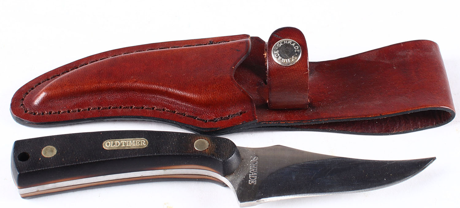 Schrade Old Timer knife, fixed blade, has leather sheath, 3'' blade. Grade: Excellent - Value: 40 to 100