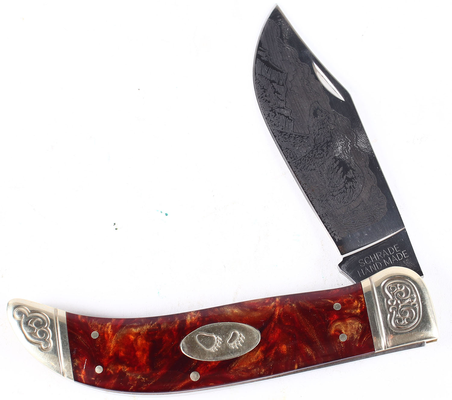 Schrade folding blade knife, 3.5'' blade with beautiful engraving of a bear on one side, Limited Issue 2007 SCL2. Grade: Excellent - Value: 40 to 150