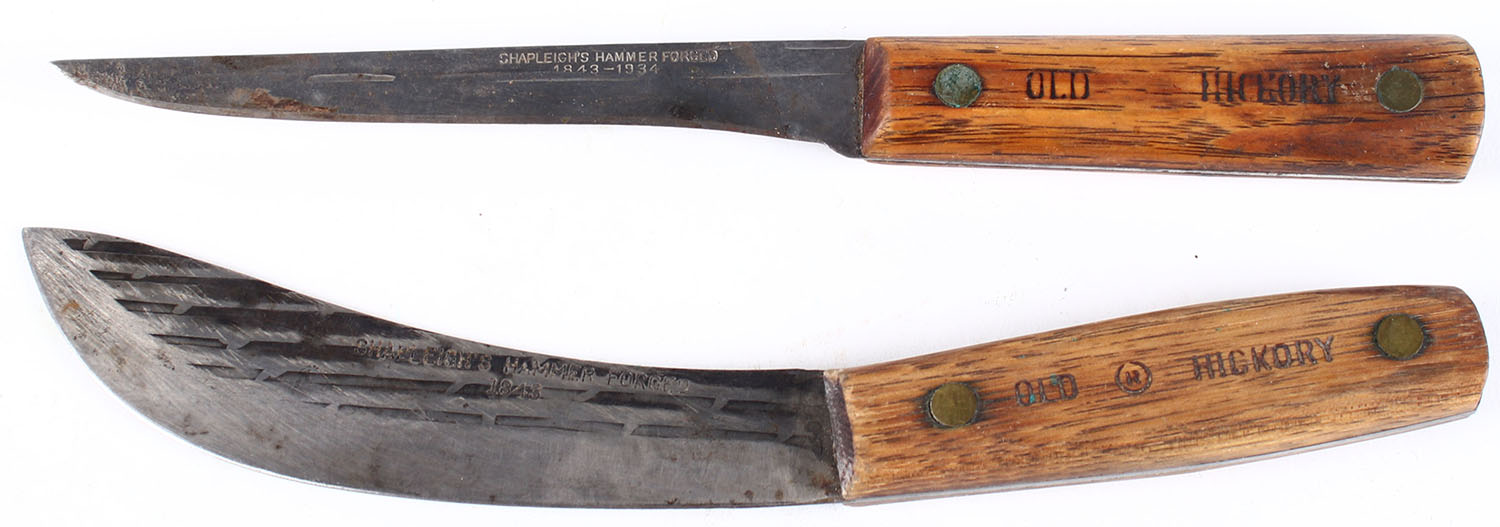 Lot of 2 Shapleighs hammer forged Old Hickory fixed blade knives, 1843-1934 and 1843 on blade, 6'' blades. Grade: Very Good ++ - Value: 40 to 150