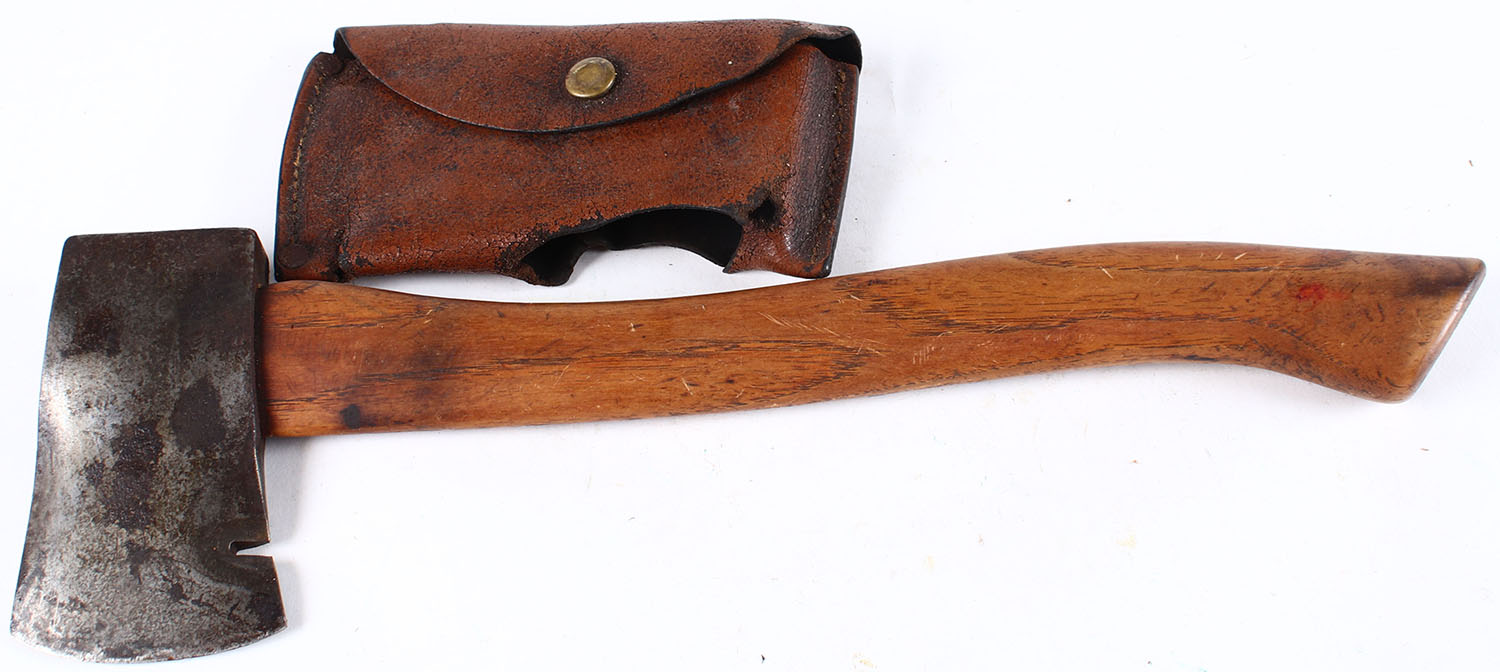 Vintage Lakeside hatchet, has wood handle, 14.5'' OAL, has age soiling to hatchet head, has leather sheath . Grade: Very Good - Value: 30 to 90