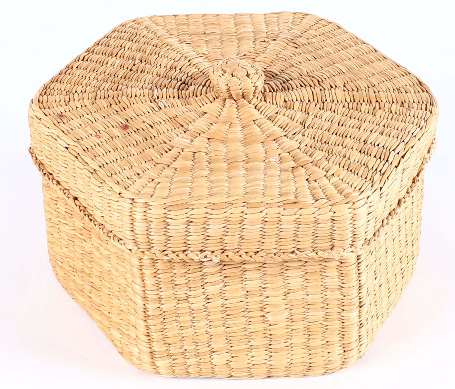 6.5'' tightly woven California Coast hex lidded basket. Grade: Excellent - Value: 50 to 250