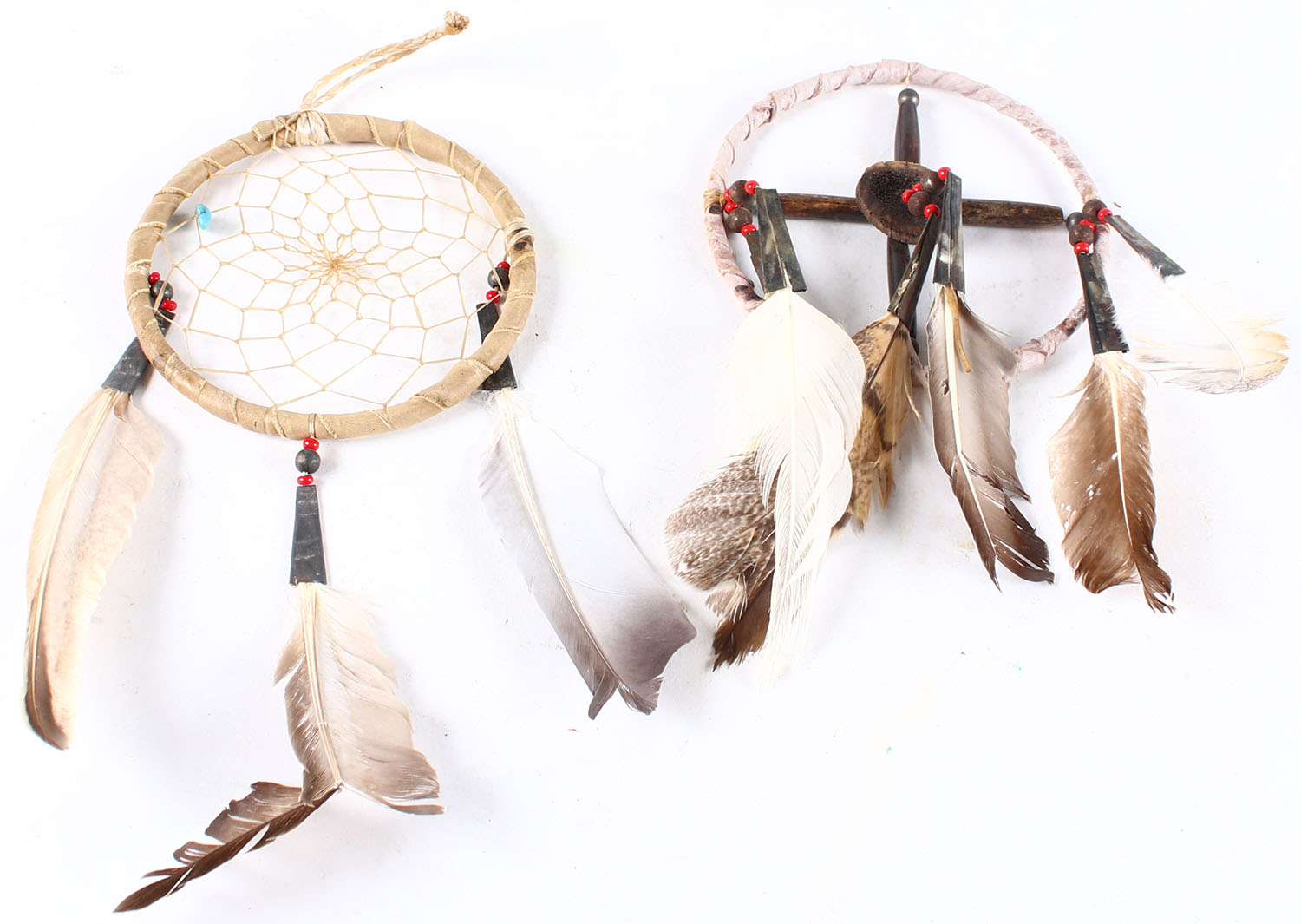 Pair of early Plains Native American Dream Catches, about 1910, feathers, trade beads and rawhide, Grade: Excellent - Value: 20 to 100